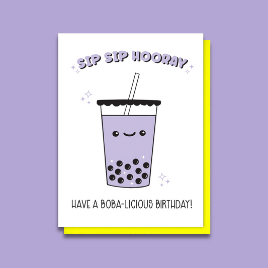 Funny Boba Birthday Letterpress Card | Sip Sip Hooray | Taro Bubble Tea | kiss and punch