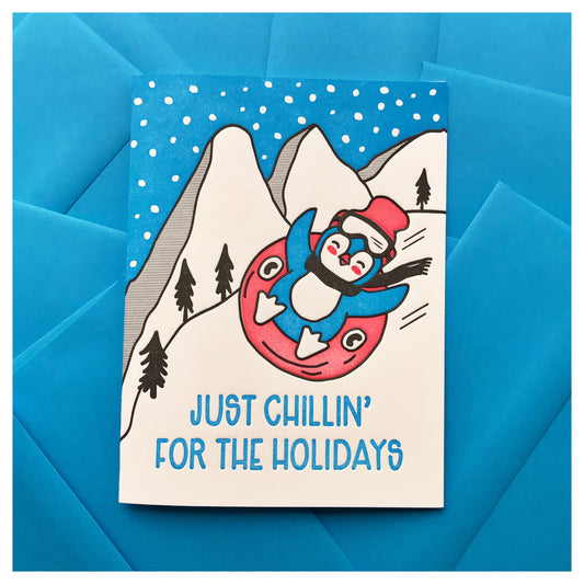Cute Chillin' Holiday Tubing Penguin Letterpress Card | kiss and punch