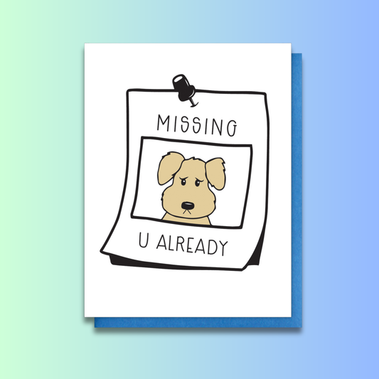 Cute Missing You Dog Card – ‘Missing U Already’ Thinking of You Letterpress Greeting Card | kiss and punch